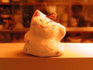 「青豆亭」さんからの頂き物2 「にゃんこ訪ねて三千里」でご紹介している「青豆亭」さんのお店にあったにゃんこです。 はりこの招き猫です。表情がとってもにこやかで、一目で気に入ってしまいました。 5cmほどの小さな招き猫ですが、存在感があります。
