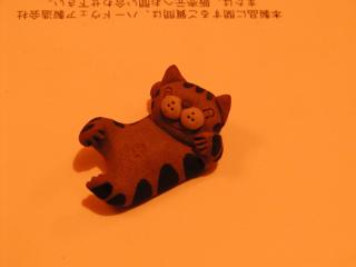 「青豆亭」さんからの頂き物3 粘土素材で作られているにゃんこです。たぶん箸置きではないかと? にゃんこの表情もさることながら、ちょこっと曲げた足と手がかわいい! お友達のうちにお呼ばれされて、こんな箸置き出されたら、「やるなっ」って思っちゃいます。