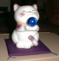 「しろママさん」からの頂き物 綺麗なブル〜の水晶玉(?)が印象的な風水ネコさんです。 私も地元のお店で実物を見ましたが、とってもかわいいです。 表情といい、ちょこんと揃えた足やしっぽも、丸ごとしあわせ〜って感じ。 ブル〜の他にもピンクや黄色もありました。 しろママさん、ありがと〜\(^o^)/