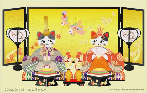 「みやもとさん」からの頂き物 ちょっ〜っと早いですが、お誕生日プレゼントとして頂きました。 みやもとさん、ありがとうございますぅ。感謝感激! 私の大好きな三毛ちゃんがお雛様(≧∇≦) 視線を合わせた二人が、ちょっと照れくさそうな感じが何とも微笑ましぃ〜。 屏風やお着物、三方などの質感はお見事!