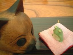 睨まれているのは、ねこ丼でもお馴染みネコ作家ねこどんさんのカエル(=^m^=)