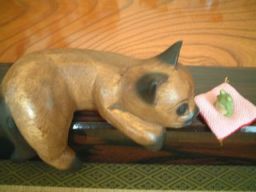 日光華厳の滝近くのお店から連れ帰った木彫りのネコさん。ポ〜ズがかわいい。