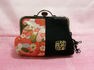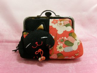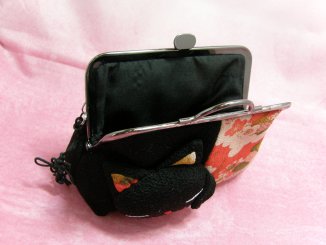 ちりめんで作られた黒猫さん付きの和柄がま口。