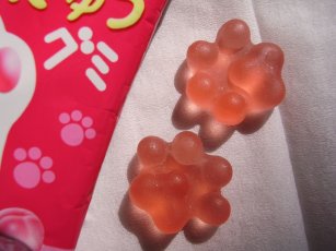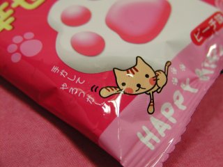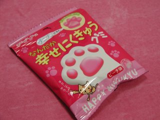 なんだか幸せにくきゅうグミ にくきゅう型のグミ。お友達からの頂き物。 パッケージのねこさんがかわいいです。