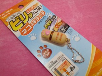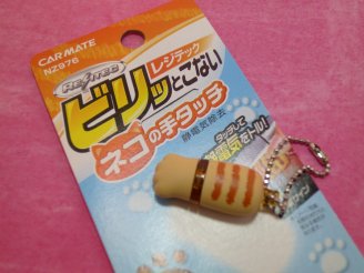 ネコの手タッチ カー用品メーカー、カーメイトの静電気除去機能付きキーホルダー。 車などの静電気が気になる部分へ肉球タッチ。イヤな静電気をとってくれます。 本体はレジテックというソフト素材。トラちゃん柄の他にピンクと黒もありました。