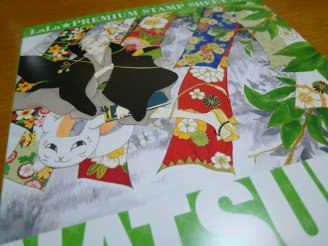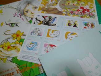 ニャンコ先生切手シート 2010年6月月刊LALA8月号の全プレ「夏目友人帳」の切手シートセット。 切手シートと2色刷りの便せんと封筒、ファイルのセット。 夏目友人帳とはいってもほとんどがニャンコ先生の切手です。