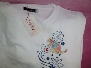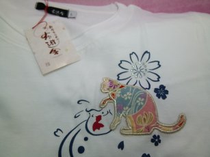 Tシャツ ちりめんねこさんが付いたTシャツ。ねこさん部分のみワッペンのようになっています。 創作ちりめん布遊舎さんのTシャツ。