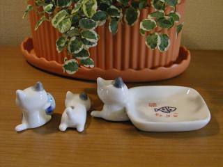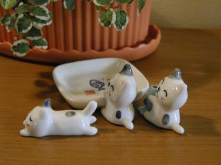 お小皿・その他 かわいいにゃんこの付いた「お小皿」「箸置き」「ようじ立て?」です。 小皿は5cmほどの大きさなので、私はアクセサリー置きに使っています。 一番左は、ようじ立てだと思うのですが、小さい花を差して使うと、とってもかわいいです。