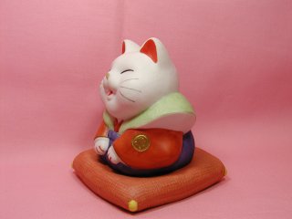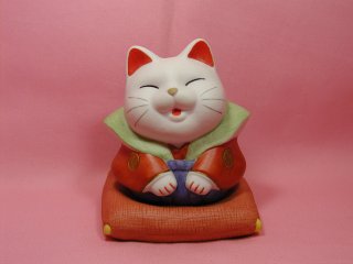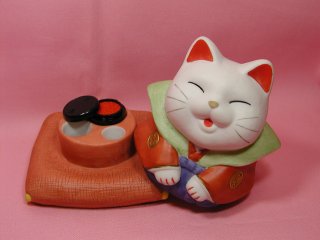 印鑑入れ 羽織袴姿のにこやかなネコさんの印鑑入れです。 お座布に朱肉と印鑑立てが付いていて、 ネコさんをかぶせておくとふつ〜のネコさんのように見えます。 お座布は、ずっしりとした焼き物なので安定感もあります。
