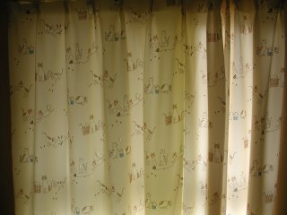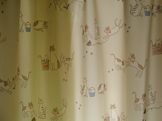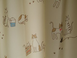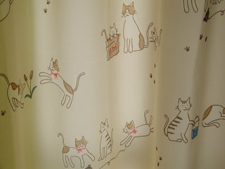 カーテン カーテンをねこさん柄にしてみました。写真が見づらくてすみません(>_<)ゞ 掛けてみるまでは「どうかなぁ〜?」と思っていたのですが、 白地に淡い色合いで描かれているので思ったよりはうるさくありません。