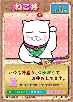 「ねこやまださん」からの頂き物 2000年12月に「ねこやまださんのぺぇぢ」さんでゲ〜ットした キリ番記念カ〜ドです。無理言って、招きねこやまださんを作って頂きました(*^_^*) ねこやまださん、ありがとうございましたぁm(_ _)m も〜これは一生モノでしょ〜。ぜひ、あなたもあなただけの素敵なカ〜ドをゲットして下さいませ〜。 さぁさぁ、一刻も早く、「ねこやまださんのぺぇぢ」へダ〜ッシュ!!!
