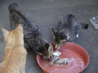 仔にゃんこ達のご飯を見守るお母さん(o^^o)