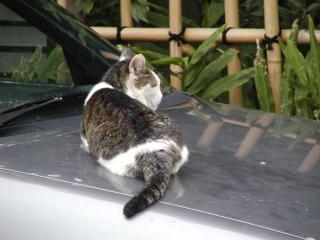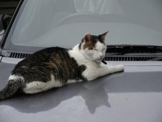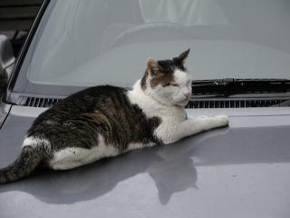 なまにゃんこの定番、ボンネットの上でにゃんこ発見。