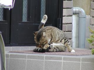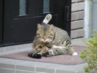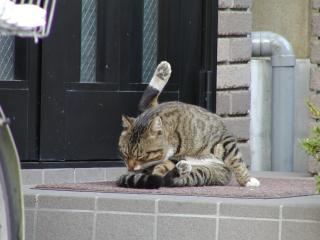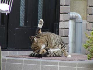 近所のお宅の前で、毛繕いに精を出すにゃんこと遭遇。