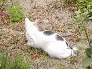 先日、釣りに行った時、近くにあった畑の中で出会ったネコさんです。 背中の模様が面白いです(=^o^=) 黒丸が4つ綺麗に並んでるの。分かります?
