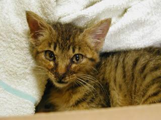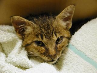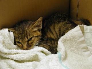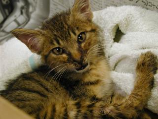 お友達のようこさんのお家に来たノラにゃんの仔猫。 優しい里親さんが見つかったと言うことで、ちょっとだけ ねこ丼家で預かりました。ん〜もう本当に仔猫は天使ですね。 風邪気味で目も鼻もクシュクシュ、ガリガリにやせ細っていましたが、 今では元気に走り回っているそうです。よかった〜(*^O^*)