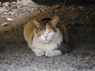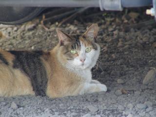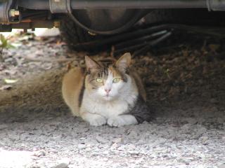 やっぱ暑い日は車の下だよね〜。 って訳で、車の下でくつろぐにゃんこ発見! よ〜く見たら、口がすぼまってる? もともとこういう口なのか? それとも緊張のあまりこうなってしまったのか・・・?