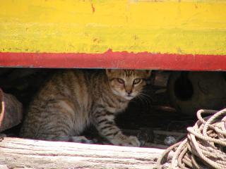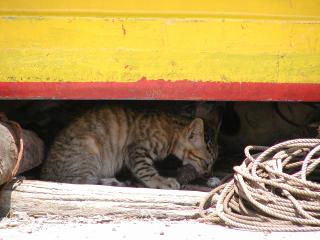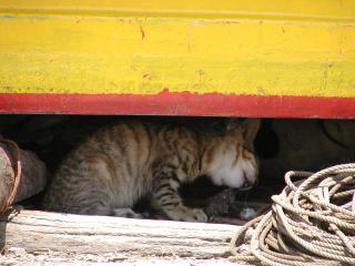釣り人からのお裾分けなのか、自分で調達したのか、 安全な船の下で、魚にむしゃぶりつくネコさん。 なんとも逞しい姿がほほえましくもあり、けなげでもあり・・・。 ちょっと複雑な心境ではありますが、必死で生きている彼らにエ〜ルを送りたい。