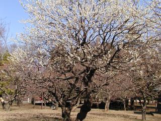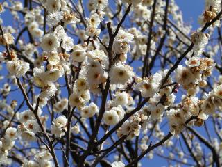 白梅、紅梅といろいろな種類の梅の木がありましたが、桜のような花びらいっぱいの梅が綺麗でした。さすがに桜ほどの華やかさはありませんが、控えめな美しさの梅の花が私は好きです。ほのかに、い〜い香りも漂っていました。んでも、桜の「お花見」って、あんなに盛んなのに、どうして梅の「お花見」ってしないのでしょうかね? |