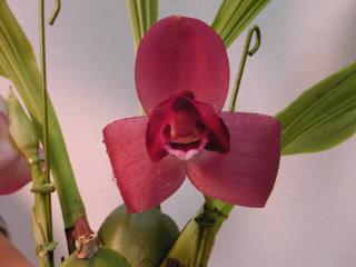 この花は、まだあまり巷には出回っていない新種の花。蘭のお仲間だそうです。・・・んな事は置いといて。よ〜くよ〜く見て下さいまし〜。なんか語りかけられているような感じがしませんか?実物を見ていた時は気が付かなかったのですが、写真を見てビックリ〜(*^O^*)「この花、顔があるぅ〜!」えっ!?なになに?水が欲しいの?「シ〜マン」みたいにきつ〜い一言が帰ってきそうで恐いわぁ(*^m^*)「お前は好きなときに好きなことが出来ていいよな〜。俺なんかさぁ」なんてね。