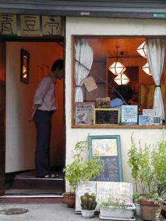 こちらが「青豆亭」の入り口です。 手作りのかわいい看板とにゃんこのメニュー看板が目印です。 お勧めは、180円の手作りサブレ(チーズ、ゴマ、海の味いろいろの3種類があります)、280円のクレープ・オ・グランマルニエだそうです。これは、すべて手作りで、私もご馳走になりましたが絶品です。おいしさはさることながら、手作りサブレは身体にも良さそう。それもそのはず、オーナーさんのお話では「素材の味をそのままお届けしたい」とのこと。しかも超破格値。こんなに安くていいの?ってかんじですが、「ほっとしたひとときを過ごしていただければ。」というお店の方のありがたいお言葉。お店の方の言葉通り、とっても落ち着けるところだと思います。大好きな本を片手に、ぜひ行ってみて下さい。 |