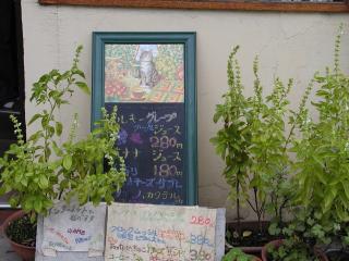 これが、私がめちゃくちゃ気に入ってしまったメニュー看板です。とってもかわいい猫が描かれています。この写真ではわかりにくいと思いますので、お近くで、気になったかたは実物を見に行ってみて下さい。 まだランチなどは出されていないということですが、3時のお茶などには、もってこいのお店です。 お勧めはフレッシュジュース。 バナナジュース 180円 バナナビーンズジュース 280円 季節のフレッシュジュース これに、 手作りサブレ 180円 クレープ・オ・グランマルニエ 280円 |
