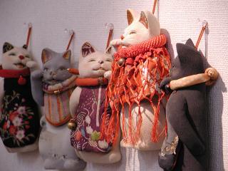![]() お見事としか言いようのない「お雛様」。ネコさんもさることながら お着物の素晴らしさには目を見張るものがあります。 ![]() 壁掛けの招き猫さんも、とっても素敵でした。 目や舌は、1度はめ込んで抜いた後、キレイに布を貼り付け、 最後にはめ込むというきめ細やかな作業なんだそうです。 |
