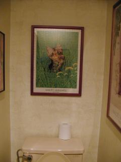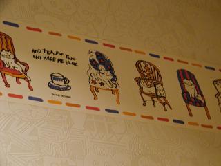 | 壁紙までニャンコでした。徹底してます。ボーダー部分もねこなら、白い部分もネコなんです。見えます? | こちらはトイレ。トイレの中までにゃんこのオンパレード。壁一面に松村誠さんのねこちゃんの絵が飾られていました。 |