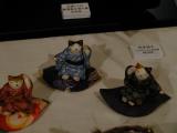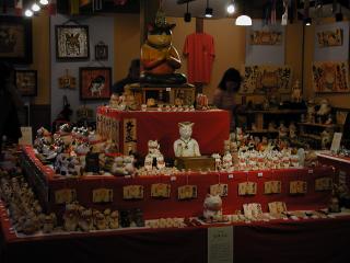 招き猫まつりでは様々な招き猫さん達を楽しむことができます。全国の郷土玩具作家さん招き猫が一同に会す「全国郷土玩具招き猫展」。ねこ丼もビックリの招き猫コレクターさん自慢の招き猫さん公開「招き猫特別展示」。全国招き猫産地から勢揃いの「来る福市」。お宝発見となるか?「骨董招き猫市」。子供達が絵付けした張り子招き猫さんの「未来の招き猫作家展」。そして、招き猫の新しい魅力満載「招き猫現代作家展」と、とにかく盛りだくさんの内容です。左の写真は大黒ホールで開催された「招き猫現代作家展」の様子です。大きなわじんさんのねこさんが鎮座していました。 |