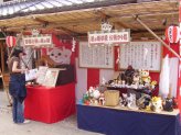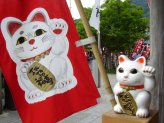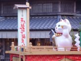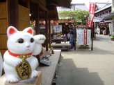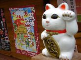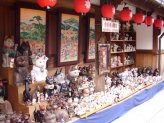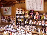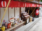 役目を終えた招き猫さんを供養して貰える「招き猫供養所」(左)や「骨董招き猫市」(右)吉兆招福亭さんの前にも沢山の招き猫さん。 |