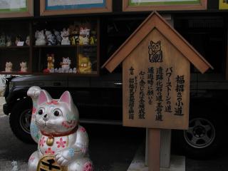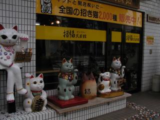 残念ながら店内の撮影は断られてしまいましたが、「外のなら撮ってもいいですよ」ということで、お言葉に甘えて撮影させて頂きました。屋外にも沢山の招き猫が展示されていました。巨大なものからウィンドウに入れられた小さなものまで、屋外だけでも結構楽しめます。テレビの撮影や芸能人の方もみえているようで、撮影風景の写真やサイン色紙なども飾られていました。 |