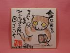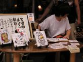 | 銀座通り商店街の中ほどにある「もやい処」の2階はギャラリーになっていて作家さんのねこさんの展示販売をしています。お店の前では猫デザイナー荒木さんが直筆色紙を描いてました。右の写真はねこ丼がお願いして描いてもらった招き猫さん。 |