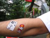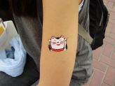 | 招き猫まつり当日は腕や顔に貼れる招き猫さんシールが配られました。招き猫さんシールを貼ると、より一層、招き猫まつりが楽しくなること間違いなしっ(≧∇≦) 招き猫さんは2種類。さすがに顔に貼っている人は見なかったなぁ。ねこ丼@旦那さんみたいな腕だと毛深いねこさんになっちゃうよ(=^m^=) はがす時もちょ〜っと大変らしい。。。です。うはは。