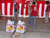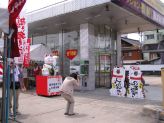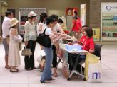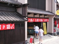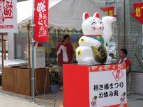 招き猫ミュージアム、おもだか屋のとなりに設置された特設スペース。冷たいお茶を飲みながら、ちょっと一休み。両手いっぱいになった招き猫さんを一つ一つ確認したり、招き猫さんのパネルから顔を出して記念撮影したり、歩き疲れてグタ〜っとなったお父さんがいたり(=^m^=)と、みなさん思い思いにくつろいでいました。おもだか屋さんで招き猫さんなどを購入すると、またまた招き猫さんなどが貰えるゲームに参加することができました。これは、やるっきゃないでしょ〜っ! |