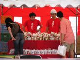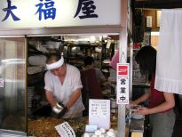 2日目のお昼は深川神社の近く宮前地下道にある「大福屋」さんで焼きそば。お好みの量のソースを自分でかけて頂きます。人気のあるお店ですし、店内もこじんまりしているので、いつもお客さんでいっぱい。おじさんがず〜っと焼きそばを作り続けていました。 |