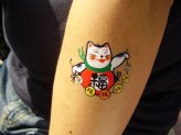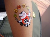 瀬戸蔵、文化センターでは招き猫シールを貼って貰えます。やっぱり、お祭り気分を楽しむためにもとりあえずね。腕や顔などに貼ってもらう招き猫さんをデザインしたシールです。携帯に貼って貰っている人もいました。今年のデザインはかなり細かくて凝ってました。