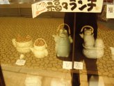 銀座通り商店街で開催されていた「どら猫市」の店先には、歴代の福々ランチのお弁当箱が展示されていました。第1回目は、もりわじんさん作。4回目までは、なんと急須付き。 |